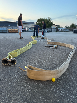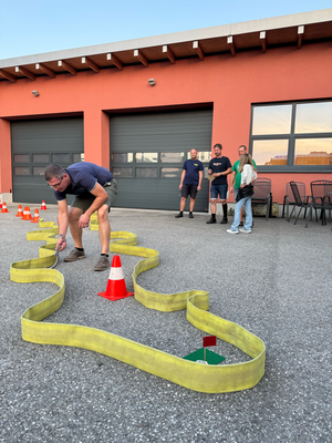 Bei den 5 unterschiedlichen Bahnen die im Feuerwehrhaus teilweise mit Feuerwehrgeräten aufgebaut waren, galt es mit so wenig Schlägen wie möglich den Ball ans Ziel zu befördern.